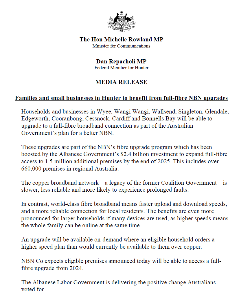 These upgrades are part of the NBN's fibre upgrade program which has been boosted by the Albanese Government's 2.4 billion investment will enable the NBN's full potential. We're giving Australian families and small businesses access to the world-class broadband infrastructure they deserve.