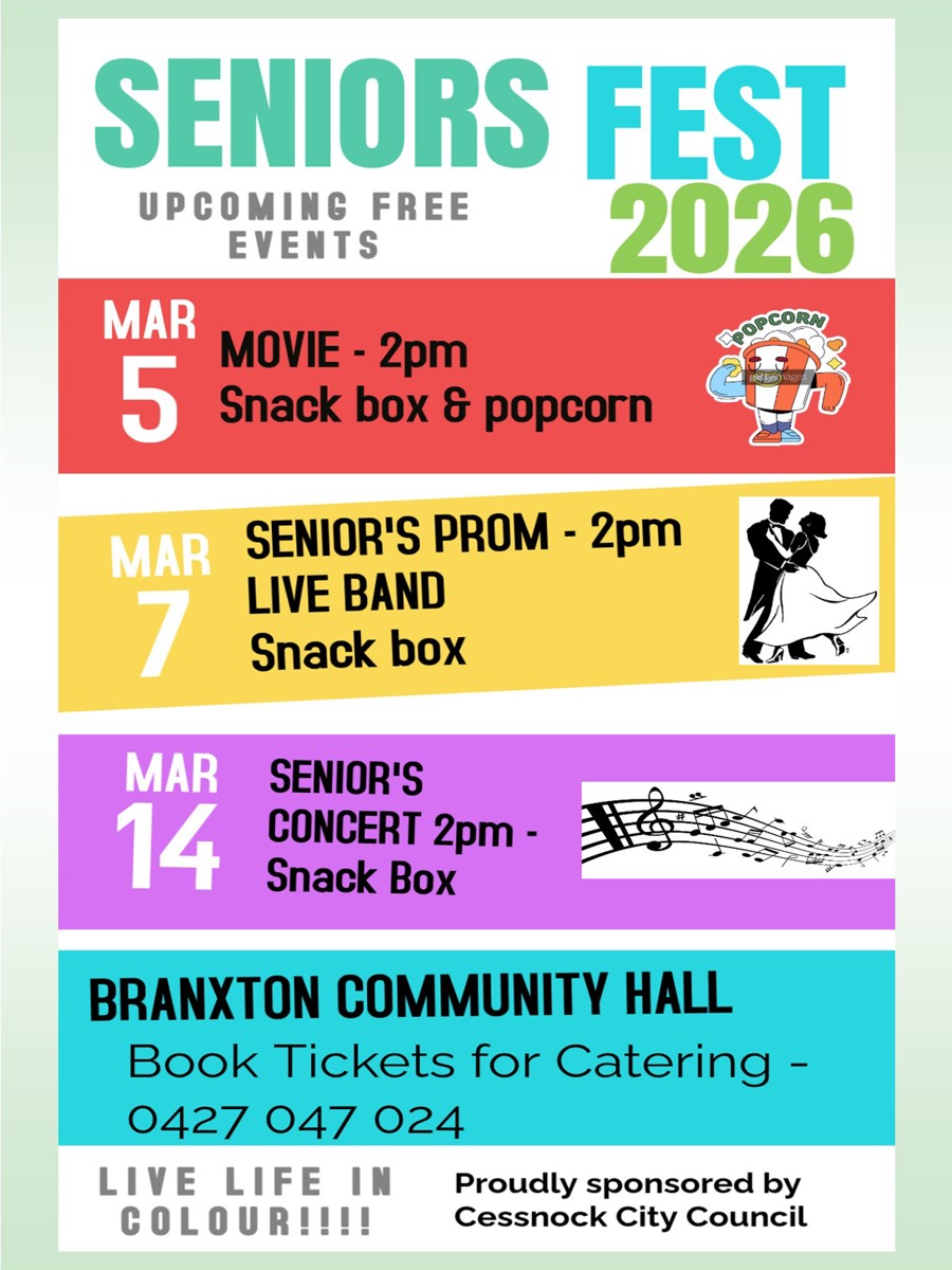 Senior events at the Branxton Community Hall in March 2026.